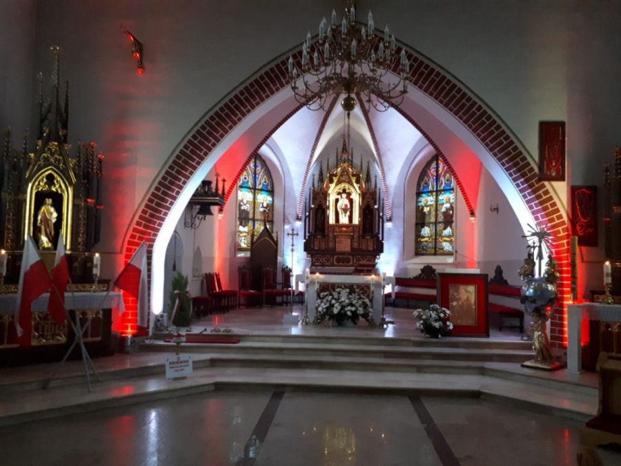 Zewnętrznym wyrazem patriotycznego świętowania były wywieszene na naszych domach flagi państwowe oraz wystrój parafialnej świątyni z wyraźnymi motywami narodowymi.