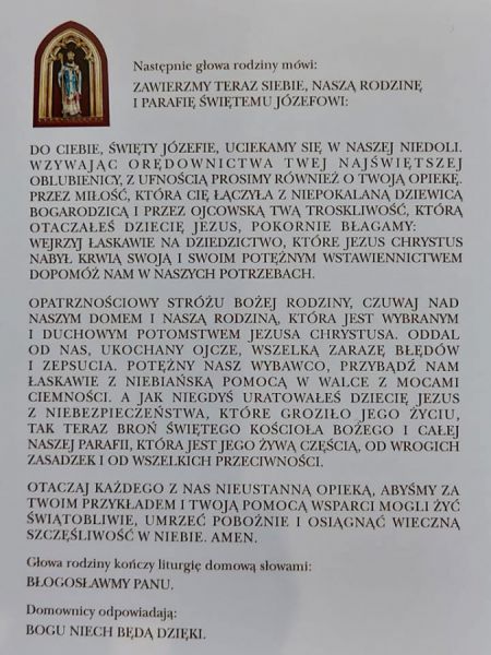 W czasie Mszy świętych kolędowych każda rodzina otrzymała folder z liturgią domową. Zachęcamy, by każdego dnia zawierzać się Bogu przez wstawiennictwo św. Józefa modlitwą, która znajduje się na ostatniej stronie foldera. Dodatkowe foldery zostały rozłożone na stoliku przy wyjściu z kościoła.